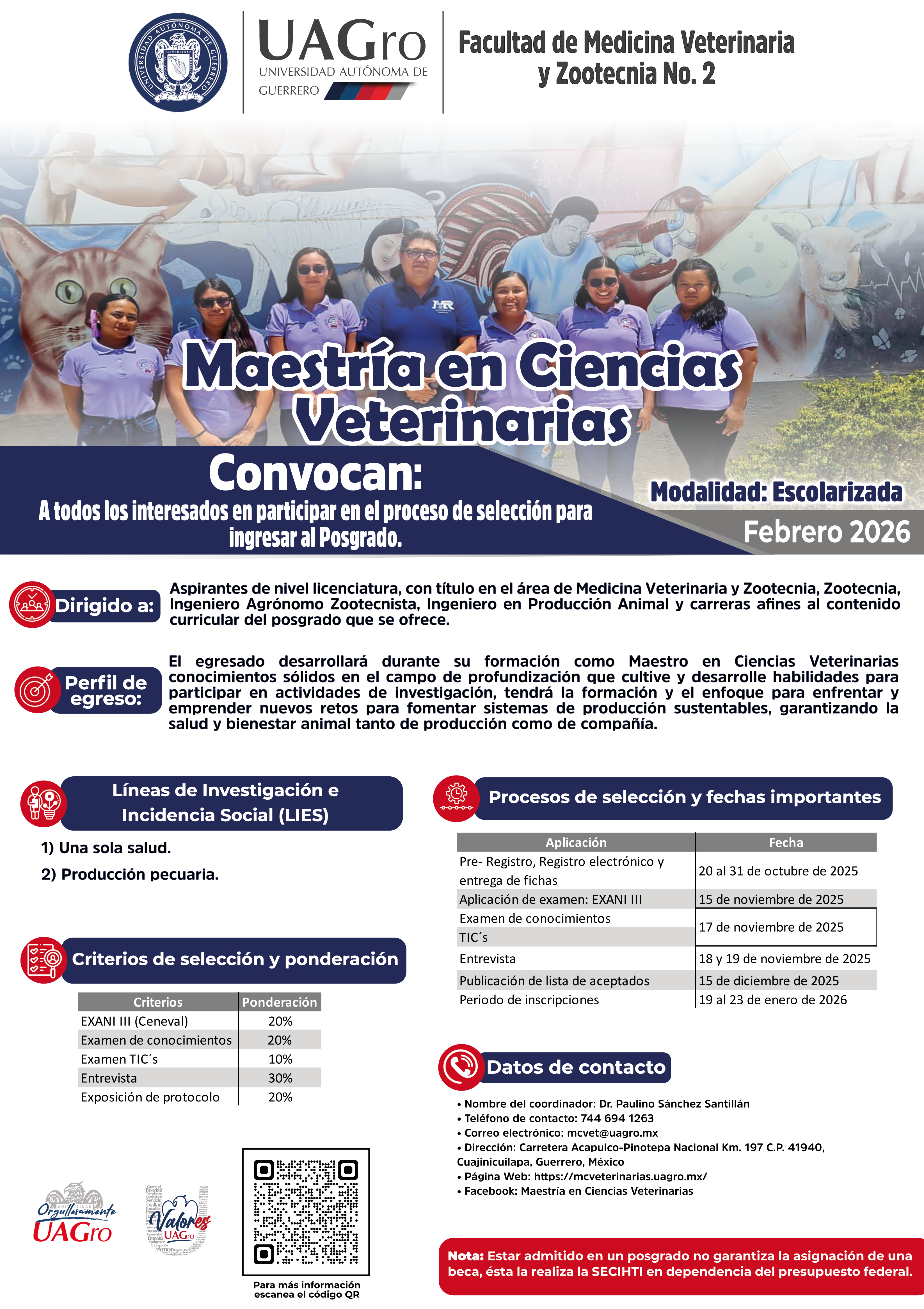 Bienvenid@s al sitio web de la Maestría en Ciencias Veterinarias (MCVet), programa de posgrado que tiene como objetivo la formación de profesionales con conocimiento científico que contribuya a la formación de profesionales capaces de generar, aplicar y difundir el conocimiento científico producto de la investigación, que contribuyan a la resolución de problemas en el área de las Ciencias Veterinarias. La MCVet es de orientación científica y cuenta con profesores experimentados en el campo disciplinar e investigativo.